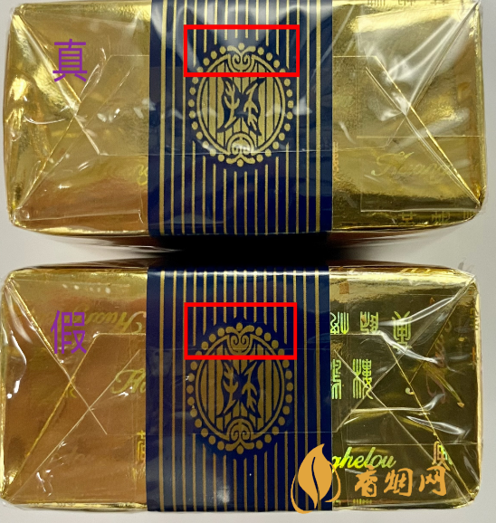 商標(biāo)紙正面對(duì)比:真煙商標(biāo)紙金色部位的色澤明亮,假煙的顏色色澤偏暗;真煙為機(jī)器包裝,封簽端正,不傾斜,假煙往往是人工手工包裝,封簽不端正,易出現(xiàn)傾斜情況;真煙圖案采取的是凹印印刷技術(shù),線條光滑完整,不會(huì)出現(xiàn)漏金現(xiàn)象;假煙印刷工藝往往較差,圖案邊緣模糊不光滑,有毛刺感,且易出現(xiàn)漏金現(xiàn)象。