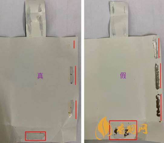 膠水印記對(duì)比:真煙煙盒側(cè)面封邊膠水印記清晰;煙盒底部膠水印記較窄的長(zhǎng)方形印記;假煙煙盒側(cè)面封邊膠水印記模糊不清晰,煙盒底部膠水印記大,為不規(guī)則的片狀。