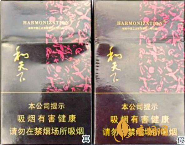 真煙底部采用全息防偽,用放大鏡可看到由“HARMONIZATION”微縮字組成的“和天下”版面圖案,且“和天下”字體筆畫(huà)較粗;假煙的全息防偽沒(méi)有立體感,用放大鏡看“HARMONIZATION”微縮字較模糊,且“和天下”字體筆畫(huà)較細(xì),與真品特征存在明顯差異。