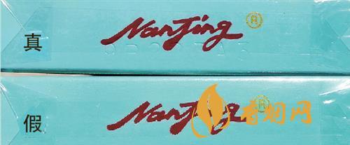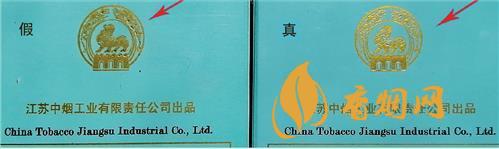 商標(biāo)紙正面工藝對比:真煙印刷質(zhì)量好,圖案無重疊且非常清晰,“NANJING”字樣摸起來有凹凸感,“南京”字樣不漏金,且清晰有光澤,;假煙“NANJING”字樣摸起來無凹凸感,“南京”字體漏金且暗淡無光。