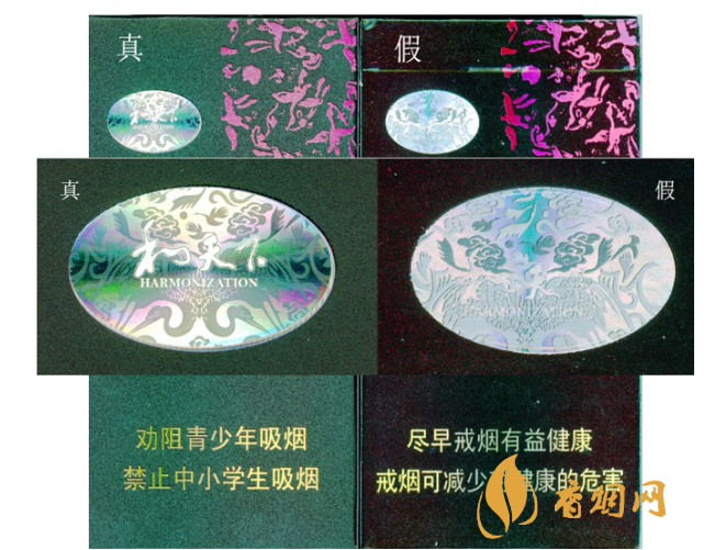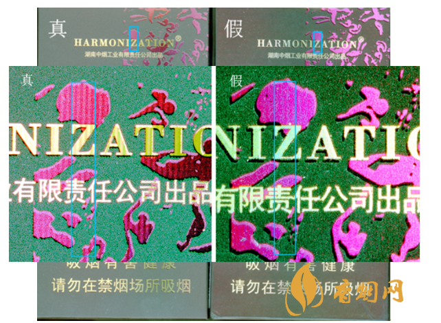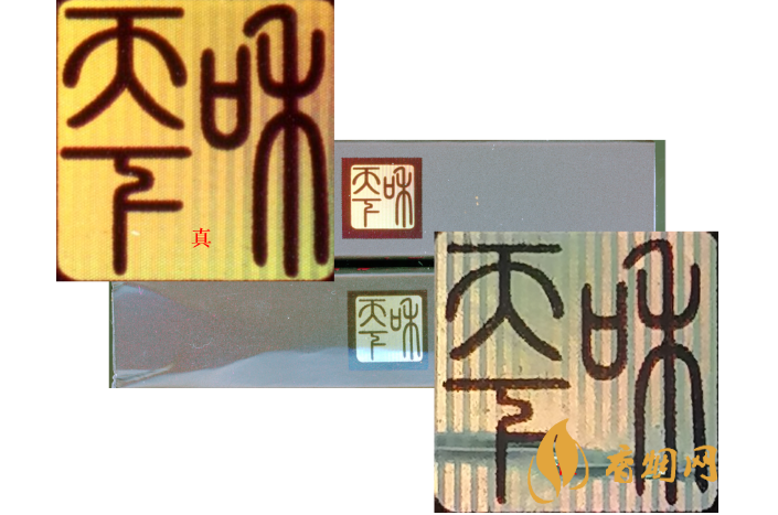 防偽技術(shù):真煙采用全息防偽技術(shù),不同角度呈現(xiàn)不同的光澤,且防偽圖案清晰。假煙的全息防偽沒有立體感,圖案模糊。
