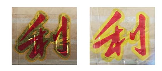 假冒卷煙:該款假冒卷煙激光全息防偽圖案暗淡無光,圖案無分層;兩側(cè)“三潭印月”都暗淡。圖1上真下假