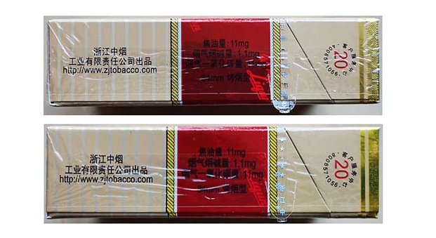 假冒卷煙:該款假冒卷煙透明紙燙封收縮雜亂、死板,無烙痕。圖2上真下假