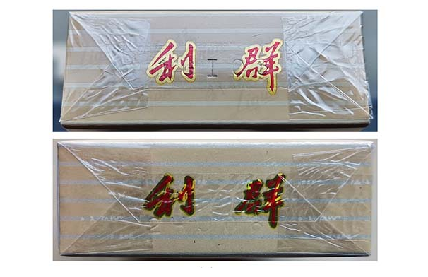 假冒卷煙:該款假冒卷煙鋼印筆畫較粗,力度相同。
