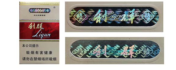 真品卷煙:防偽與紙張?zhí)子?zhǔn)確,激光全息防偽圖案明亮清晰,圖案分層出現(xiàn);左側(cè)“三潭印月”采用微縮印刷防偽,正面觀察左側(cè)塔身“亮”,右側(cè)塔身“暗”。