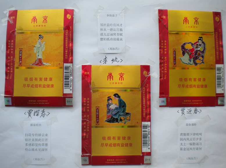 7、賈探春。賈府排行三小姐,有心機,善決斷,精明能干。她發(fā)起在大觀園建立“詩社”,賈寶玉和眾姐妹都響應(yīng)。煙盒上的探春,白衣紅裙,一手握筆,一手執(zhí)紙箋,吟詩作賦,絢麗多彩。