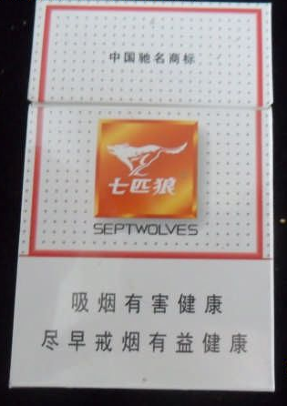 6、七匹狼(白) 條盒、小盒商標(biāo)主體圖案正方框采用紅黃色彩漸變推移過渡,圖案投影極富立體感的防偽技術(shù)