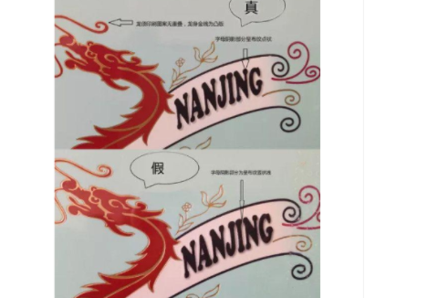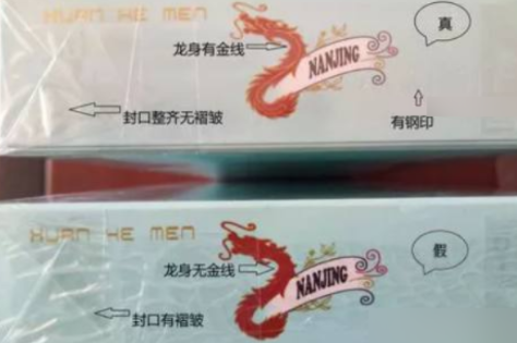 2、看條盒圖標(biāo),真煙“南京”二字字體端正清晰,龍須印刷圖案無重疊,龍身金線為凸版,條盒金邊無毛刺;假煙“南京”二字字體向左微傾,龍須有疊痕錯層,龍身顏色為褐紅色、金線為凹版,條盒金邊有毛刺。