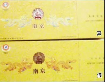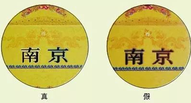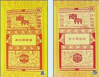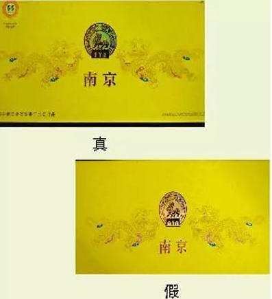 真品“南京”(九五之尊)與假煙的條盒存在明顯差異。真煙條盒正面底色花紋發(fā)光,有立體感,雙龍圖案摸上去有凹凸感,“南京”兩字和麒麟圖案套色均勻,凹凸明顯,印刷精致;而假煙的底色無光澤,看上去呆板,印刷粗糙,套色不夠均勻。