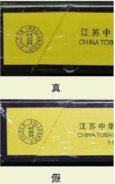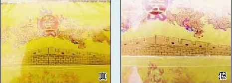 真煙條盒正面的“雙龍”圖案經(jīng)日光或手電光照射一定時間后,在黑暗處會呈現(xiàn)瑩光色;假煙則無瑩光色。