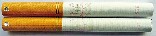 煙支印刷差異對(duì)比:真煙煙支過濾嘴上的兩個(gè)金色圓圈較寬;假煙煙支過濾嘴上的兩個(gè)金色圓圈較窄。
