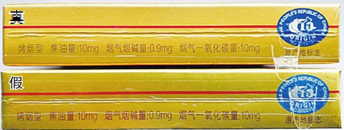 小盒側(cè)面翻蓋處差異對(duì)比:真煙翻蓋處切口平整,且商標(biāo)盒金色部分印刷呈均勻細(xì)密的網(wǎng)格狀;假煙翻蓋處切口不平整,有毛刺,商標(biāo)盒金色部分印刷呈較粗較大的網(wǎng)格狀。