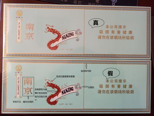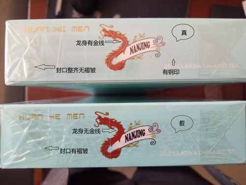 看條盒顏色,真煙為淡藍(lán)色,顏色柔和純正;假煙為淺藍(lán)色,視覺上顏色不是自然色。看條盒圖標(biāo),真煙“南京”二字字體端正清晰,龍須印刷圖案無(wú)重疊,龍身金線為凸版,條盒金邊無(wú)毛刺;假煙“南京”二字字體向左微傾,龍須有疊痕錯(cuò)層,龍身顏色為褐紅色、金線為凹版,條盒金邊有毛刺。