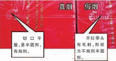 真品“中華”的開拉帶頭切口平整,呈半圓形,有規(guī)則;假“中華”的開拉帶頭有毛刺,形狀為不規(guī)則半圓形。