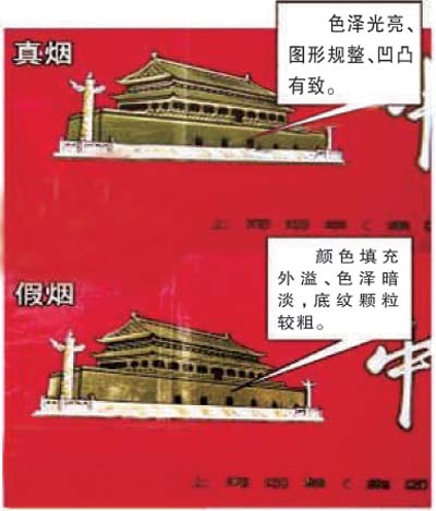 真品“中華”的條盒透明紙摩擦系數(shù)小,手感光滑;假“中華”的透明紙摩擦系數(shù)大,摸上去比較粗糙,光澤也差。真品“中華”條盒上的天安門圖案色澤光亮、圖形規(guī)整、凹凸有致;假“中華”上的天安門圖案顏色填充外溢、色澤暗淡,底紋顆粒較粗。