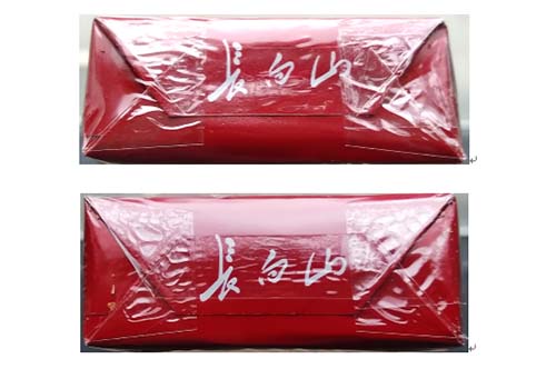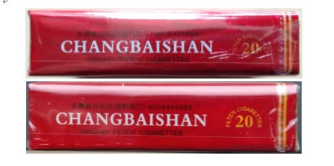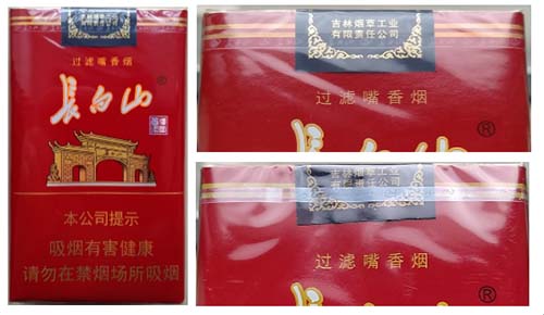 真品卷煙:1.商標(biāo)紙采用膠印,商標(biāo)紙紅色面印刷呈現(xiàn)密集、均勻的細(xì)小顆粒痕跡,有磨砂感。2.拉線上長(zhǎng)白山字體和商標(biāo)圖案清晰、明亮。3.封簽紙上字體和花團(tuán)圖案“金色”明亮,字體清晰。