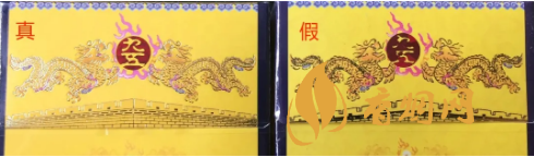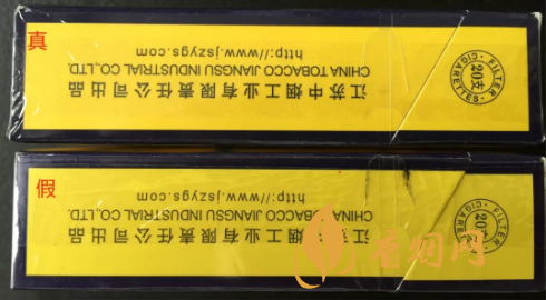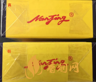 條盒:真品條盒正面底色花紋具有立體感,雙龍圖案凹凸感明顯,“南京”字樣及麒麟圖案套色均勻。假煙底色無光澤,印刷粗糙,雙龍圖案模糊不清。