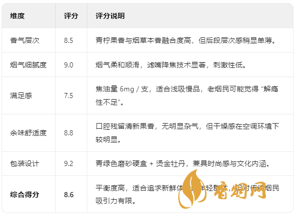 為客觀反映牡丹恒大天青細(xì)支的口感表現(xiàn),結(jié)合專業(yè)品鑒與網(wǎng)友反饋,以下為綜合評分(滿分10分):