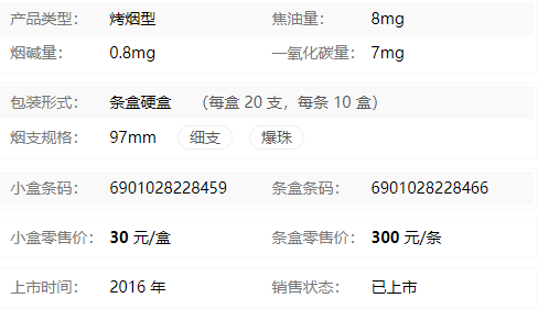 | 類型 :烤煙型 | 焦油量 :8mg | 煙氣煙堿量 :0.8mg | 一氧化碳量 :7mg |
