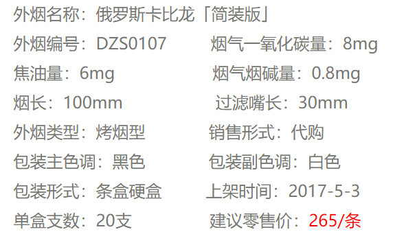 以上是小編整理的有關俄羅斯卡比龍香煙價格表圖和俄羅斯卡比龍多少錢一包的相關資料信息,希望能夠對大家了解相關情況有所幫助,想獲得更多消息資訊請關注香煙網(wǎng)!