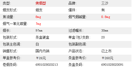 三沙(細(xì)支)將純天然高濃縮的海南綠橙汁以爆珠的形式添加至卷煙當(dāng)中,使得煙氣清甜可口,既不失煙草的本香,又保存了橙子原有的功效,并采用保潤鎖香以及多重過濾技術(shù),口感醇和溫潤。