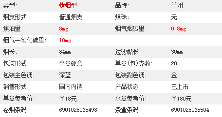 | 煙長(zhǎng):84mm | 過濾嘴長(zhǎng):30mm | 包裝形式:條盒硬盒 | 單盒(包)支數(shù):20 |