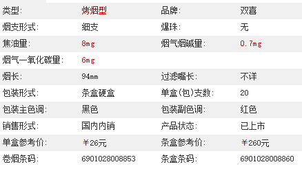 以上是小編整理的有關(guān)雙喜春天細(xì)支多少錢一包和雙喜春天細(xì)支香煙價格圖片的相關(guān)資料信息,希望能夠?qū)Υ蠹伊私庀嚓P(guān)情況有所幫助,想獲得更多消息資訊請關(guān)注香煙網(wǎng)!