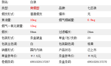以上是小編整理的有關(guān)七匹狼白色盒子的多少錢(qián)和七匹狼白色盒子的煙價(jià)格查詢(xún)的相關(guān)資料信息,希望能夠?qū)Υ蠹伊私庀嚓P(guān)情況有所幫助,想獲得更多消息資訊請(qǐng)關(guān)注香煙網(wǎng)!