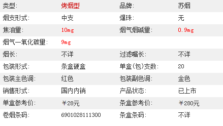 以上是小編整理的有關(guān)五星紅中蘇煙多少錢一盒和蘇煙五星紅中支價(jià)格表和圖片的相關(guān)資料信息,希望能夠?qū)Υ蠹伊私庀嚓P(guān)情況有所幫助,想獲得更多消息資訊請(qǐng)關(guān)注香煙網(wǎng)!
