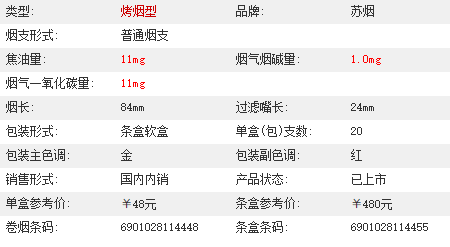 | 煙長:84mm | 過濾嘴長:24mm | 包裝形式:條盒硬盒 | 單盒(包)支數(shù):20 |