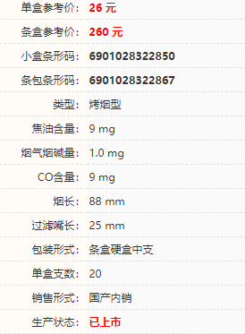 | 煙長(zhǎng):88mm | 過(guò)濾嘴長(zhǎng):25mm | 包裝形式:條盒硬盒 | 單盒(包)支數(shù):20 |