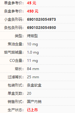 | 煙長:84mm | 過濾嘴長:25mm | 包裝形式:條盒軟盒 | 單盒(包)支數(shù):20 |