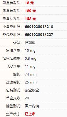 | 煙長:74mm | 過濾嘴長:25mm | 包裝形式:條盒軟盒 | 單盒(包)支數(shù):20 |