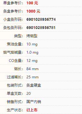 | 煙長(zhǎng):84mm | 過濾嘴長(zhǎng):25mm | 包裝形式:條盒硬盒 | 單盒(包)支數(shù):20 |