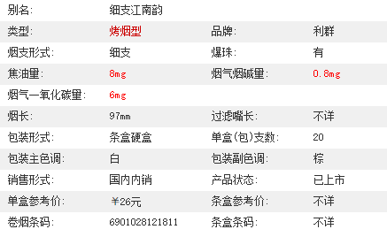 以上是小編整理的有關利群江南韻多少一包細支爆珠和利群江南韻價格表圖片的相關資料信息,希望能夠對大家了解相關情況有所幫助,想獲得更多消息資訊請關注香煙網!
