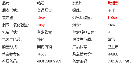 | 類型 :烤煙型 | 焦油量 :10mg | 煙氣煙堿量 :1mg | 一氧化碳量 :10mg |