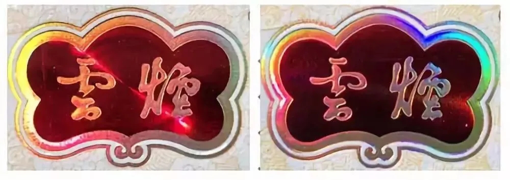 真品卷煙:云煙注冊商標圖案,紅色底紋采用3D立體透視技術(shù)。轉(zhuǎn)動商標圖案,會有鐳射光柱隨角度變動而轉(zhuǎn)動。