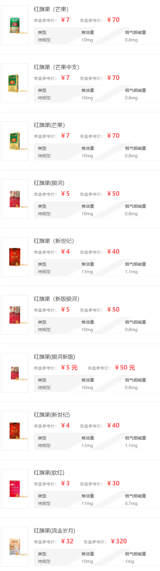 紅旗渠香煙多少錢一包,紅旗渠香煙品牌包括了,紅旗渠(軟銀河之光),紅旗渠(軟紅),紅旗渠(新開(kāi)元),紅旗渠(天行健),紅旗渠(硬金),紅旗渠(嘉年華),紅旗渠(長(zhǎng)河之韻),紅旗渠(硬銀),紅旗渠(世紀(jì)之光),紅旗渠(硬金紅)等。接下來(lái)就讓小編帶著大家一起去看看有關(guān)紅旗渠香煙多少錢一包的相關(guān)消息,希望看完之后大家能找到答案。