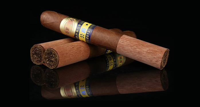 工藝:原料甄選于中南美洲多米尼加茄衣煙葉、亞洲印尼和種植于海南的古巴煙種作為茄心茄套煙葉;采用天然溶洞窖藏,在大自然恒溫恒濕的環(huán)境中(常年20℃, 濕度70%)緩慢柔和地進行二次發(fā)酵,去除茄衣煙葉的青雜氣,提升柔和度與飽滿度,獨具高級手工雪茄特有的茄香。