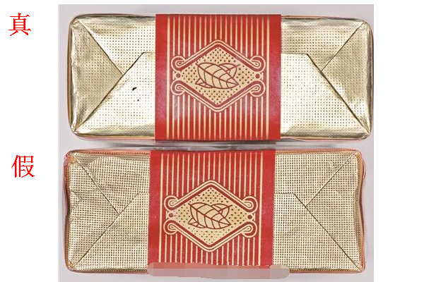 假冒卷煙封豎簽線條較細(xì),兩片煙葉旁邊的小圓點(diǎn)有的排列無(wú)規(guī)則、大小不均勻,內(nèi)襯紙上的點(diǎn)排列緊密呈明顯的網(wǎng)格狀;小盒封簽印刷和內(nèi)襯紙與真品特征存在明顯差異。