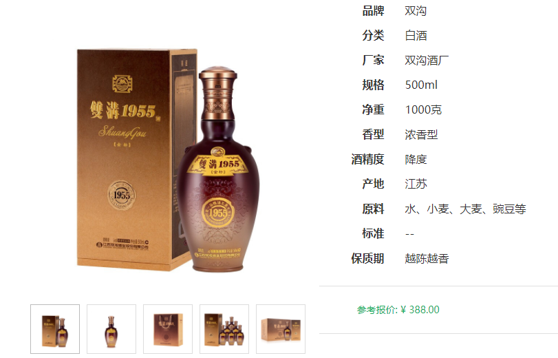 江蘇省雙溝酒1955金標(biāo)42°度濃香型純糧食白酒500ml*6瓶一整套裝的京東官方價格是2322元,一瓶裝的官方零售價格大概388元。雙溝1955金標(biāo)42度怎么樣呢?接下來詳細(xì)給大家介紹。