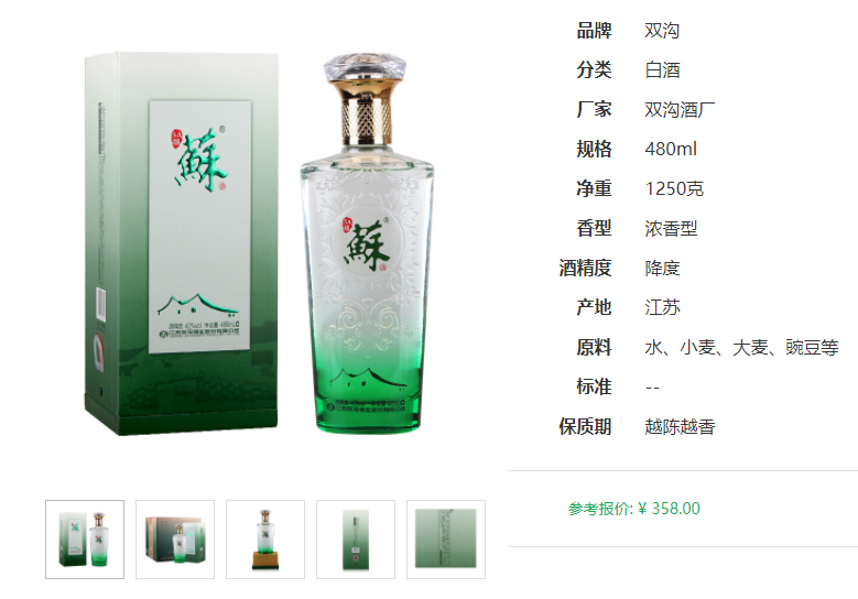 江蘇省雙溝酒蘇酒5A級42°度濃香型純糧食白酒480ml*4瓶一整箱裝的京東官方價格是1300元,一瓶裝的官方零售價格大概358元。雙溝蘇酒5A級42度怎么樣呢?接下來詳細(xì)給大家介紹。