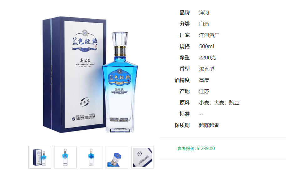洋河藍(lán)色經(jīng)典高之藍(lán)是采用低溫入窖和低溫餾酒,高溫制曲、高溫堆積,老窖窖齡長,發(fā)酵周期長、多糧釀造、多輪底發(fā)酵,多味勾調(diào)釀制而成,香氣幽雅宜人,入口綿柔順喉。