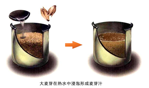 1、大麥芽在熱水中浸泡,釋放出麥芽糖,形成麥芽糖汁,即麥芽汁。