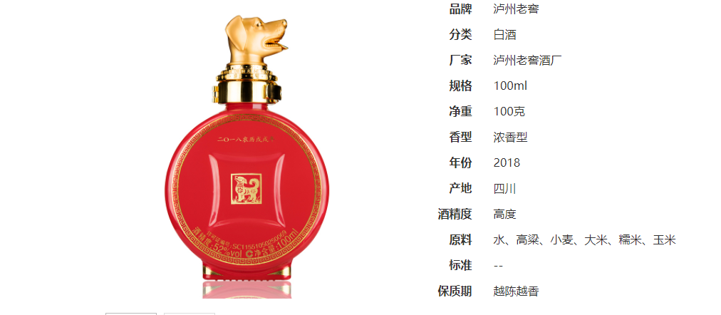 瀘州老窖狗年新春生肖酒作為瀘州老窖的系列產(chǎn)品,自然是一款濃香型白酒,該酒采用瀘州老窖獨特的釀造工藝釀制而成,產(chǎn)品倒杯后香氣撲鼻、酒質(zhì)清澈;入口有醇香、無刺激感;入喉微微刺激、無灼燒感,能夠讓消費者最大限度體驗濃香型白酒風(fēng)格。此外這款酒還具有酒后不上頭、不口干、醒酒較快的特點。