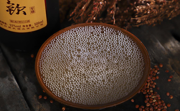 蕩香觀其色,主要看酒的顏色和粘稠度等。將酒倒入杯中,觀察酒的顏色、黏稠度、掛杯效果等。醬香型陳年好酒,顏色會(huì)發(fā)黃,酒象膠水一樣粘稠,倒在杯中,酒會(huì)沿著酒杯壁慢慢往上蔓延,達(dá)到一定的高度;而一般的醬香型白酒雖然顏色也會(huì)發(fā)黃,但是會(huì)象水一樣沒有黏稠度,在酒杯壁上蔓延的高度很小。造成這種情況的主要原因是陳年老酒的酒精分子聚合了,形成了大分子的酒精,分子間的作用力大,整體的表面張力大,而時(shí)間短的醬香型白酒的酒精分子沒有聚合,還是小分子,分子間的作用力小,整體的表面張力小。