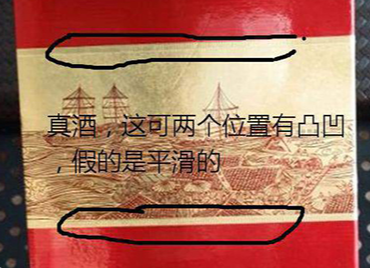 2、盒子上的瀘州老窖商標,真酒也是有凹凸感的,假的則沒有。