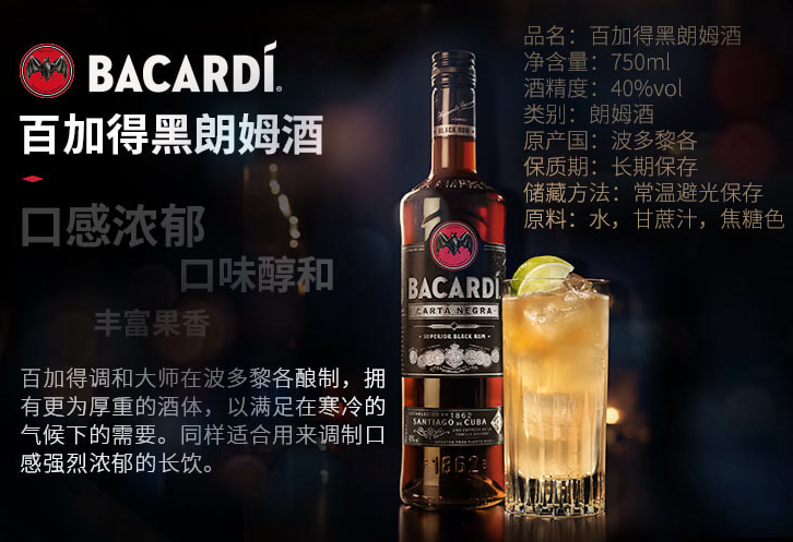 百加得黑朗姆酒是一種近似棕紅色的深色朗姆酒,以甘蔗汁、甘蔗糖漿為原料,經發(fā)酵、蒸餾而釀制。黑朗姆酒原產地為波多黎哥,用來調制雞尾酒,口感格外飽滿。