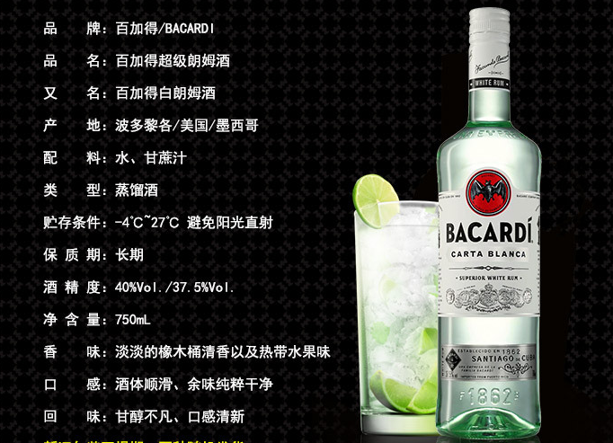 百加得白朗姆酒精選來自熱帶天堂拉丁美洲甘蔗、酵母和加勒比山泉水發(fā)酵,經(jīng)過陳年釀制,酒體順滑,口感醇滑。味感輕盈而又干爽的百加得朗姆酒可以和任何軟飲料和果汁搭配。