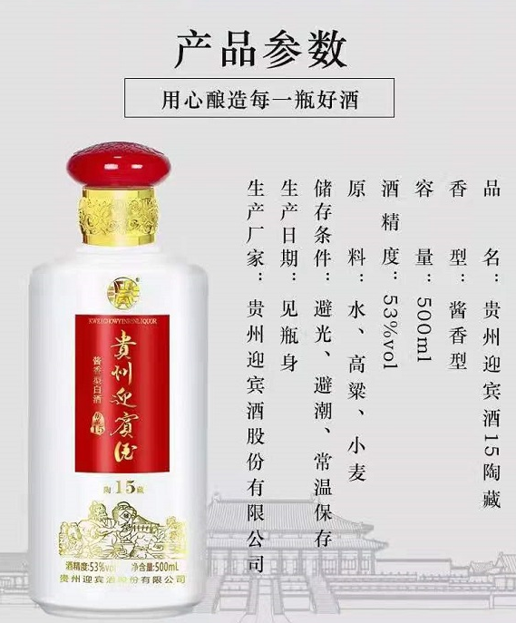 53度貴州迎賓酒陶藏15,傳承傳統(tǒng)醬香“12987”工藝釀造而成,色清透明,醬香突出,醇香馥郁,幽雅細膩,入口柔綿,清冽甘爽,酒體醇厚豐滿,回味悠長的特點。